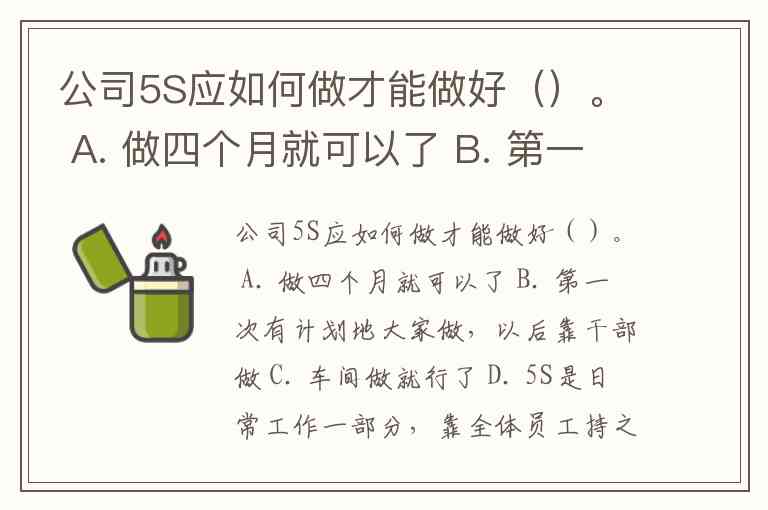 公司5S应如何做才能做好()。 A. 做四个月就可以了 B. 第一次有计划地大家做,以后靠干部做 C. 车间做就行了 D. 5S是日常工作一部分,靠全体员工持之以恒地做下去