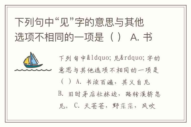 下列句中“见”字的意思与其他选项不相同的一项是( ) A. 书读百遍,其义自见 B. 旧时茅店社林边,路转溪桥忽见。 C. 天苍苍,野茫茫,风吹草低见牛羊。 D. 空山不见人,但闻人语响。
