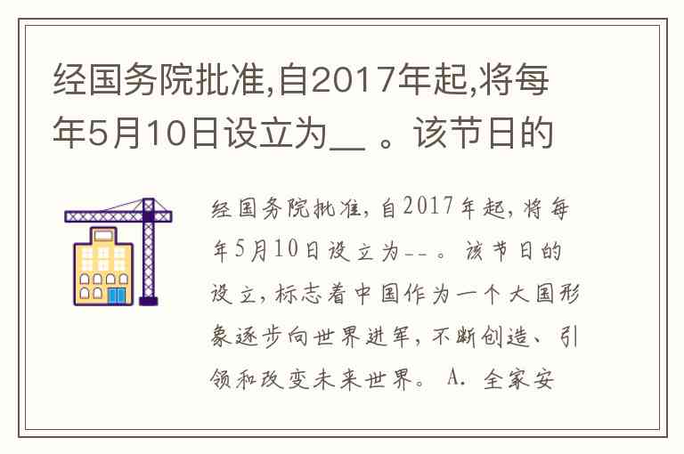经国务院批准,自2017年起,将每年5月10日设立为__ 。该节日的设立,标志着中国作为一个大国形象逐步向世界进军,不断创造、引领和改变未来世界。 A. 全家安全教育日 B. 中国品牌日 C. 国家安全日 D. 国家创新日