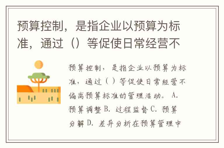 预算控制,是指企业以预算为标准,通过()等促使日常经营不偏离预算标准的管理活动。 A. 预算调整 B. 过程监督 C. 预算分解 D. 差异分析