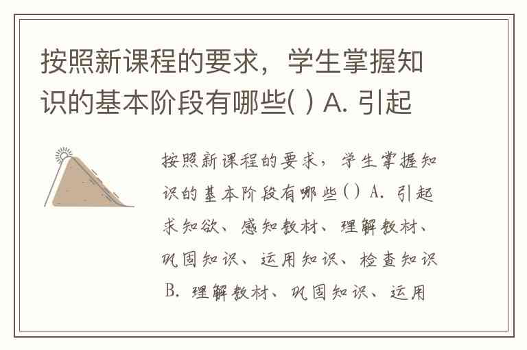 按照新课程的要求,学生掌握知识的基本阶段有哪些( ) A. 引起求知欲、感知教材、理解教材、巩固知识、运用知识、检查知识 B. 理解教材、巩固知识、运用知识、检查知识 C. 引起求知欲、感知教材、理解教材、巩固知识 D. 预习知识、学习知识、理解知识