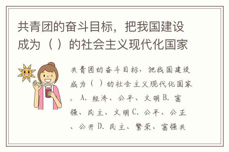 共青团的奋斗目标,把我国建设成为( )的社会主义现代化国家。 A. 经济、公平、文明 B. 富强、民主、文明 C. 公平、公正、公开 D. 民主、繁荣、富强
