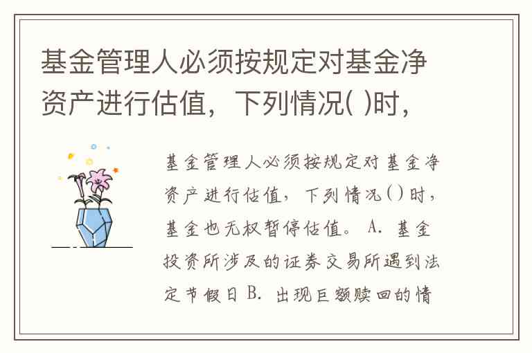 A. 基金投资所涉及的证券交易所遇到法定节假日(有权暂停):这是最常见的暂停估值情形。因为基金的资产价值很大程度上取决于交易所的收盘价,如果交易所休市,没有产生交易价格,就无法进行准确的公允估值,因此可以暂停。