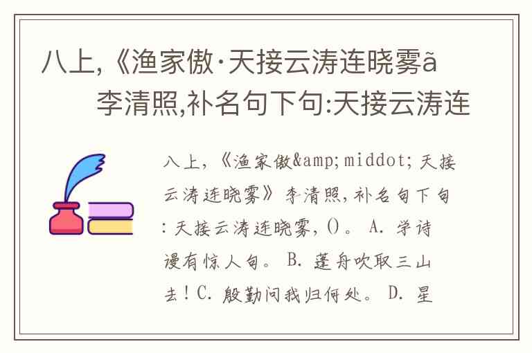 八上,《渔家傲·天接云涛连晓雾》李清照,补名句下句:天接云涛连晓雾,()。 A. 学诗谩有惊人句。 B. 蓬舟吹取三山去! C. 殷勤问我归何处。 D. 星河欲转千帆舞。
