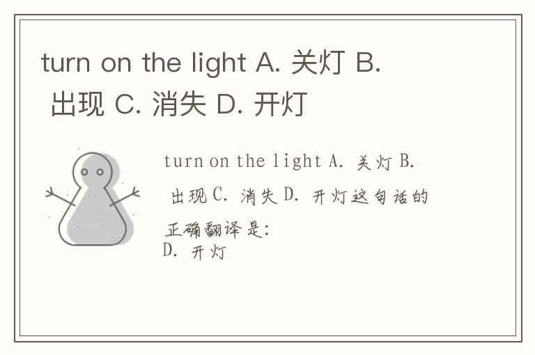 turn on the light A. 关灯 B. 出现 C. 消失 D. 开灯