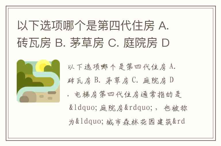 以下选项哪个是第四代住房 A. 砖瓦房 B. 茅草房 C. 庭院房 D. 电梯房