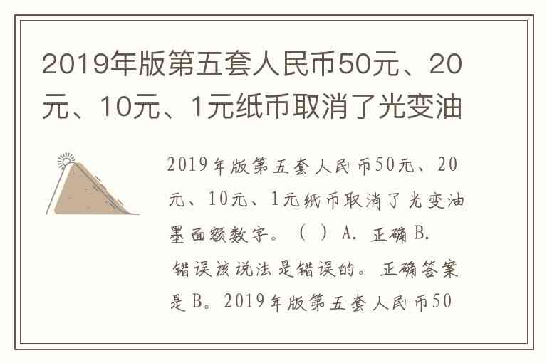 2019年版第五套人民币50元、20元、10元、1元纸币取消了光变油墨面额数字。( ) A. 正确 B. 错误