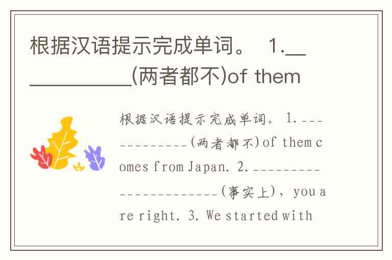 根据汉语提示完成单词。 1.____________(两者都不)of them comes from Japan. 2.______________________(事实上),you are right. 3. We started with soup and____________________(以……结束)with fruits. 4. You can sleep and eat_________ ___________(在甲板上). 5. Have you ever_________ __________(与……争论)your father?
