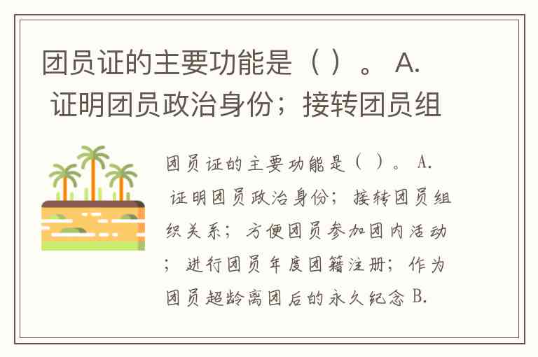 团员证的主要功能是( )。 A. 证明团员政治身份;接转团员组织关系;方便团员参加团内活动;进行团员年度团籍注册;作为团员超龄离团后的永久纪念 B. 证明团员政治身份;接转团员组织关系;方便团员参加团内活动 C. 证明团员政治身份;接转团员组织关系;进行团员年度团籍注册 D. 证明团员政治身份;接转团员组织关系;作为团员超龄离团后的永久纪念