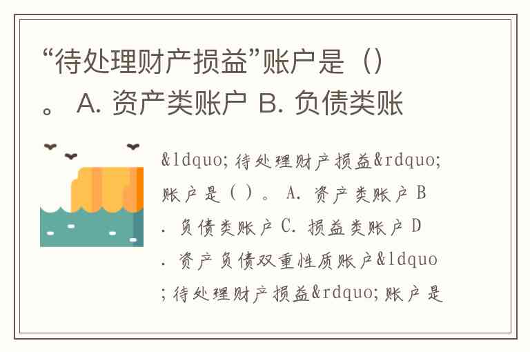 “待处理财产损益”账户是()。 A. 资产类账户 B. 负债类账户 C. 损益类账户 D. 资产负债双重性质账户