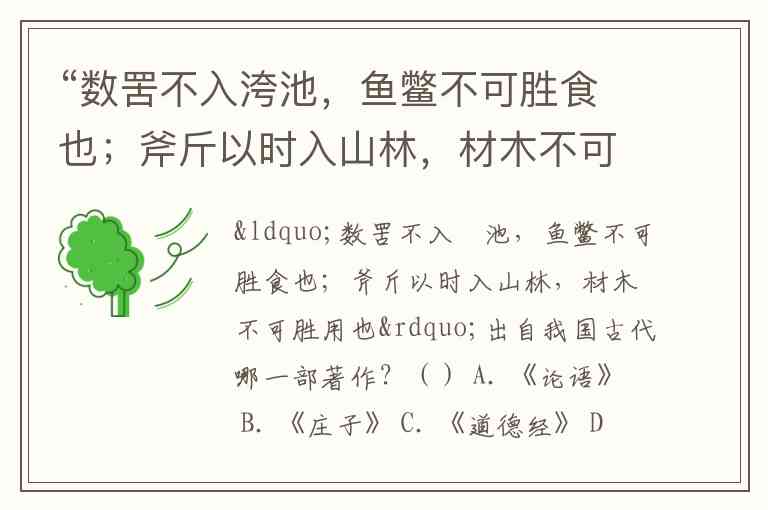 “数罟不入洿池,鱼鳖不可胜食也;斧斤以时入山林,材木不可胜用也”出自我国古代哪一部著作?() A. 《论语》 B. 《庄子》 C. 《道德经》 D. 《孟子》