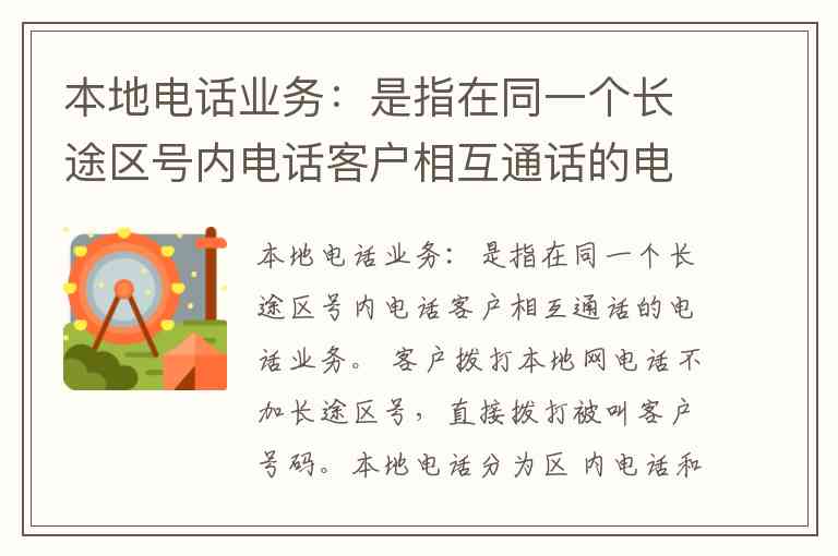“本地电话业务:是指在同一个长途区号内电话客户相互通话的电话业务。客户拨打本地网电话不加长途区号,直接拨打被叫客户号码。本地电话分为区内电话和区间电话。”