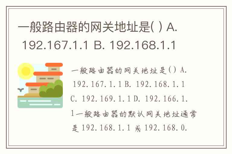 一般路由器的网关地址是( ) A. 192.167.1.1 B. 192.168.1.1 C. 192.169.1.1 D. 192.166.1.1