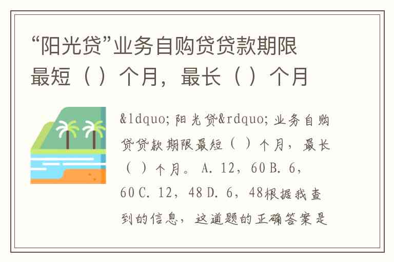 “阳光贷”业务自购贷贷款期限最短( )个月,最长( )个月。 A. 12,60 B. 6,60 C. 12,48 D. 6,48