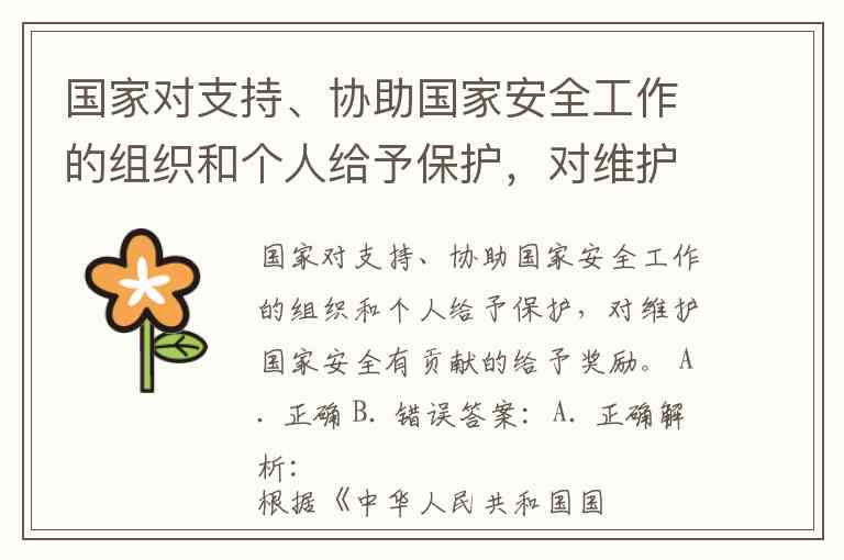 国家对支持、协助国家安全工作的组织和个人给予保护,对维护国家安全有贡献的给予奖励。 A. 正确 B. 错误