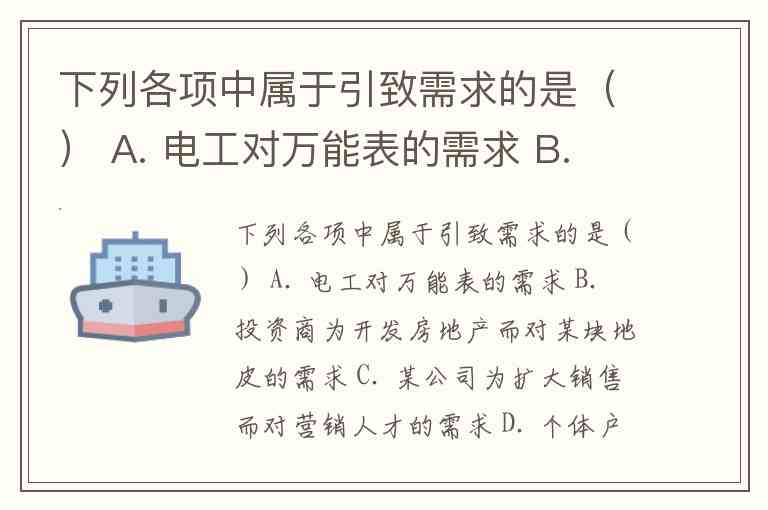 下列各项中属于引致需求的是() A. 电工对万能表的需求 B. 投资商为开发房地产而对某块地皮的需求 C. 某公司为扩大销售而对营销人才的需求 D. 个体户李某为跑运输而对卡车的需求 E. 农民为了销售玉米对玉米地的需求