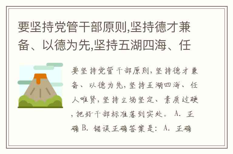 要坚持党管干部原则,坚持德才兼备、以德为先,坚持五湖四海、任人唯贤,坚持立场坚定、素质过硬,把好干部标准落到实处。 A. 正确 B. 错误