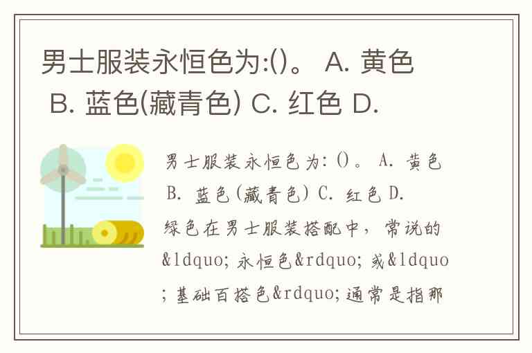 男士服装永恒色为:()。 A. 黄色 B. 蓝色(藏青色) C. 红色 D. 绿色