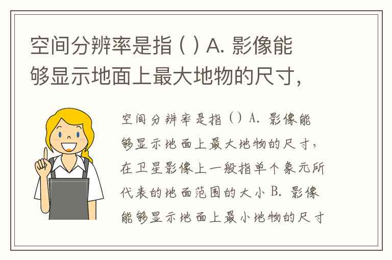 空间分辨率是指 ( ) A. 影像能够显示地面上最大地物的尺寸,在卫星影像上一般指单个象元所代表的地面范围的大小 B. 影像能够显示地面上最小地物的尺寸,在卫星影像上一般指单个象元所代表的地面范围的大小 C. 影像能够显示地面上最大地物的尺寸,在卫星影像上一般指多个象元所代表的地面范围的大小 D. 影像能够显示地面上最小地物的尺寸,在卫星影像上一般指多个象元所代表的地面范围的大小