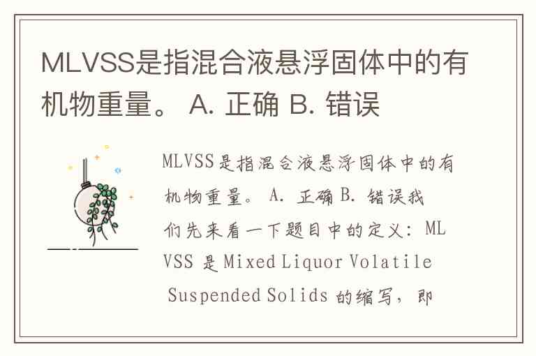 题目中说“MLVSS是指混合液悬浮固体中的有机物重量”,这其实是日常解释的近似说法。严格意义上,MLVSS 是“挥发性固体”,确实主要是有机物,但也包括一部分无机盐(如铵盐等在高温下挥发),所以不完全等于有机物重量。在工程应用与教材中,经常直接当作“活性污泥中有机物部分的重量”来理解,如果题目不要求特别精确,可能会判对。