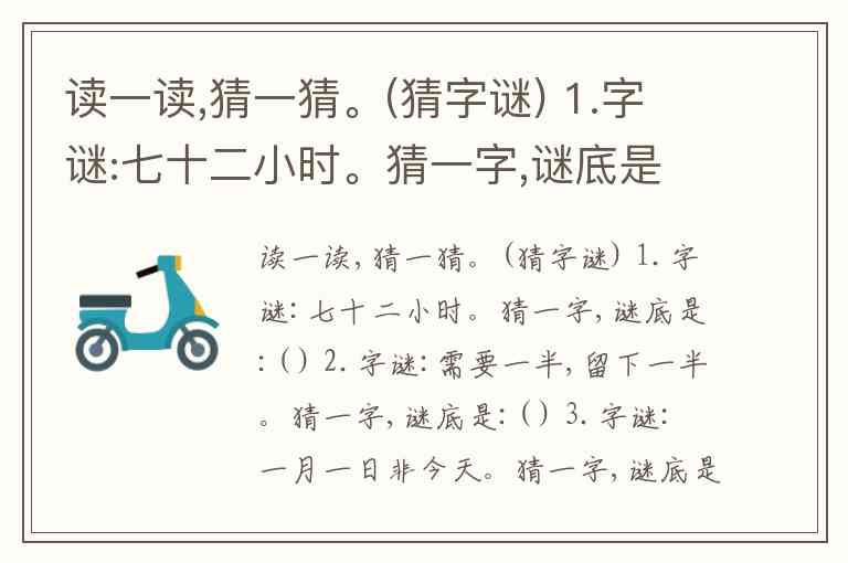 读一读,猜一猜。(猜字谜) 1.字谜:七十二小时。猜一字,谜底是:( ) 2.字谜:需要一半,留下一半。猜一字,谜底是:( ) 3.字谜: 一月一日非今天。猜一字,谜底是:( ) 4.字谜:一口吃掉牛尾巴,猜一个字谜底是:( )