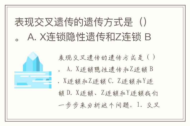 表现交叉遗传的遗传方式是()。 A. X连锁隐性遗传和Z连锁 B. X连锁和Z连锁 C. Z连锁和Y连锁 D. X连锁、Z连锁和Y连锁