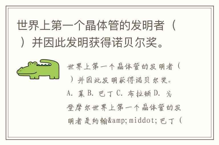 世界上第一个晶体管的发明者( )并因此发明获得诺贝尔奖。 A. 莱 B. 巴丁 C. 布拉顿 D. 戈登摩尔