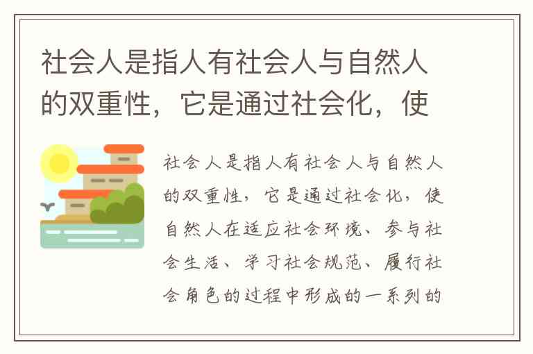 社会人是指人有社会人与自然人的双重性,它是通过社会化,使自然人在适应社会环境、参与社会生活、学习社会规范、履行社会角色的过程中形成的一系列的行为模式的人。