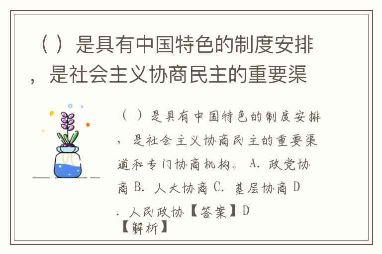 ( )是具有中国特色的制度安排,是社会主义协商民主的重要渠道和专门协商机构。 A. 政党协商 B. 人大协商 C. 基层协商 D. 人民政协