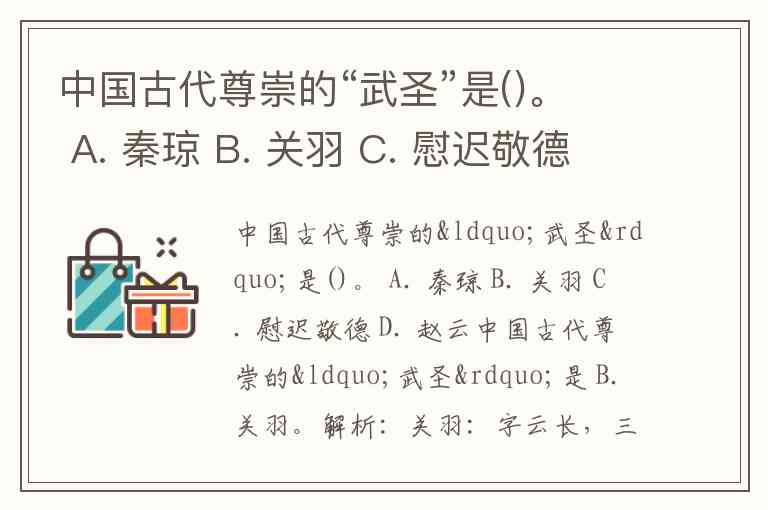 中国古代尊崇的“武圣”是()。 A. 秦琼 B. 关羽 C. 慰迟敬德 D. 赵云
