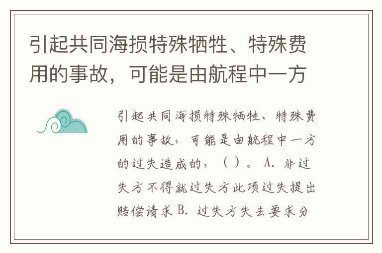 引起共同海损特殊牺牲、特殊费用的事故,可能是由航程中一方的过失造成的,不影响该方要求分摊共同海损的权利;但是,非过失方或者过失方可以就此项过失提出赔偿请求或者进行抗辩。-2