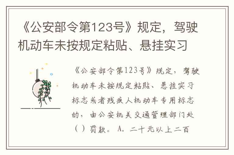 《公安部令第123号》规定,驾驶机动车未按规定粘贴、悬挂实习标志或者残疾人机动车专用标志的,由公安机关交通管理部门处()罚款。 A. 二十元以上二百元以下 B. 二百元以上一千元以下 C. 一千元以上两千元以下 D. 两千元以上五千元以下