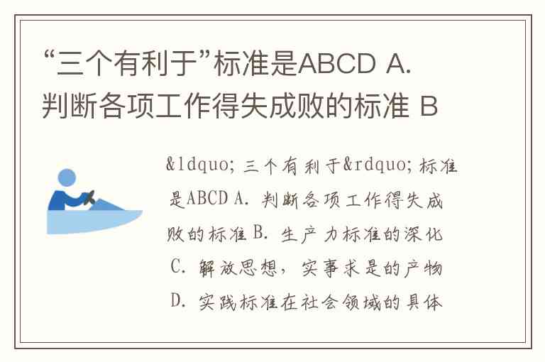 “三个有利于”标准是ABCD A. 判断各项工作得失成败的标准 B. 生产力标准的深化 C. 解放思想,实事求是的产物 D. 实践标准在社会领域的具体化 E. 姓“资”姓“社”的判断标准
