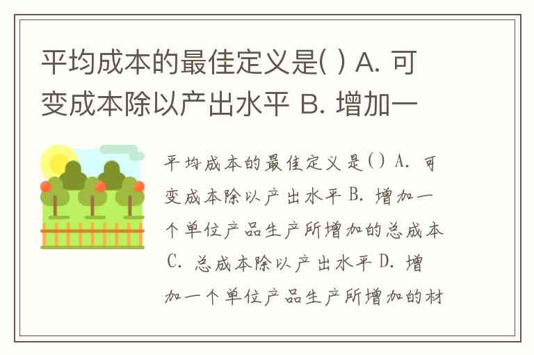 平均成本的最佳定义是( ) A. 可变成本除以产出水平 B. 增加一个单位产品生产所增加的总成本 C. 总成本除以产出水平 D. 增加一个单位产品生产所增加的材料成本