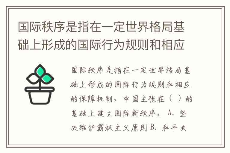 国际秩序是指在一定世界格局基础上形成的国际行为规则和相应的保障机制,中国主张在( )的基础上建立国际新秩序。 A. 坚决维护霸权主义原则 B. 和平共处五项原则 C. 第三世界国家优先原则 D. 国家综合实力强大