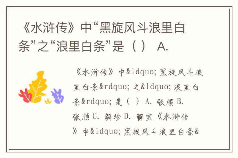 《水浒传》中“黑旋风斗浪里白条”之“浪里白条”是( ) A. 张横 B. 张顺 C. 解珍 D. 解宝