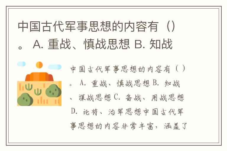 中国古代军事思想的内容有()。 A. 重战、慎战思想 B. 知战、谋战思想 C. 备战、用战思想 D. 论将、治军思想