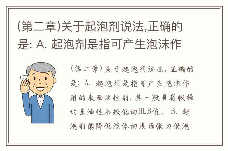 起泡剂是指可产生泡沫作用的表面活性剂,但说其“具有较强的亲油性和较低的HLB值”是错误的,起泡剂一般是亲水性较强、HLB值较高的表面活性剂。A错