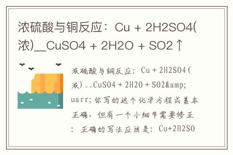浓硫酸与铜反应:Cu + 2H2SO4(浓)__CuSO4 + 2H2O + SO2↑