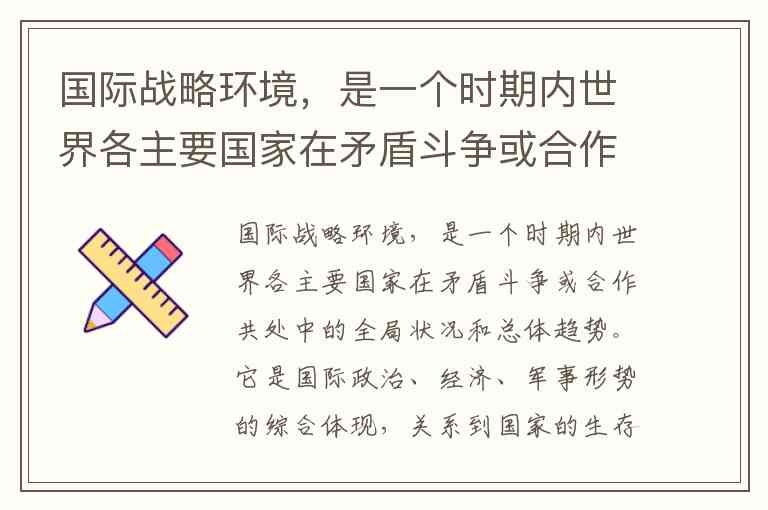 题干给出了“国际战略环境”的定义,包括它是“各主要国家在矛盾斗争或合作共处中的全局状况和总体趋势”,是“国际政治、经济、军事形势的综合体现”,关系到“国家的生存与发展”,影响“军事斗争的对象、任务和目标”,是“各个国家在国际环境中生存必须首先考察和关注的外部环境和条件”。