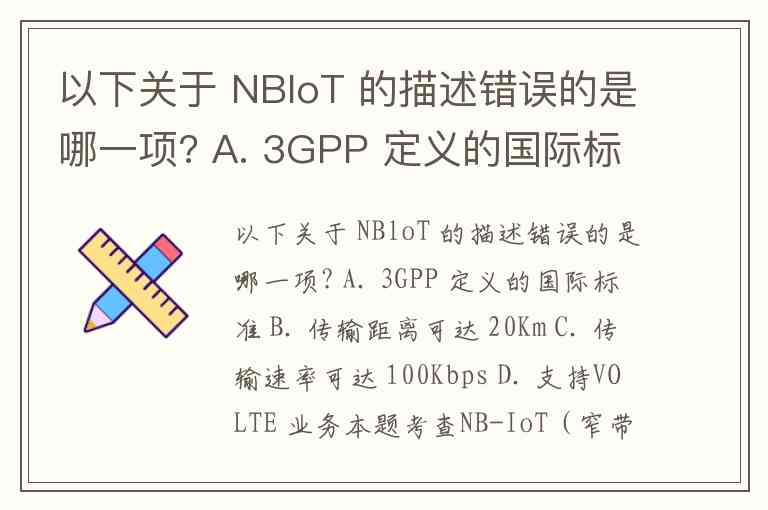 以下关于 NBloT 的描述错误的是哪一项? A. 3GPP 定义的国际标准 B. 传输距离可达 20Km C. 传输速率可达 100Kbps D. 支持VOLTE 业务