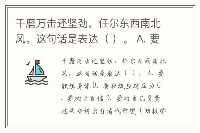 千磨万击还坚劲,任尔东西南北风。这句话是表达( )。 A. 要锻炼身体 B. 要积极应对压力 C. 要树立自信 D. 要对自己负责