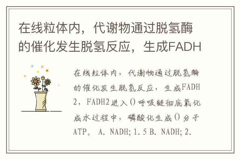在线粒体内,代谢物通过脱氢酶的催化发生脱氢反应,生成FADH2,FADH2进入()呼吸链彻底氧化成水过程中,磷酸化生成()分子ATP。 A. NADH;1.5 B. NADH;2.5 C. NADH;3 D. FADH2;1.5 E. FADH2;2.5