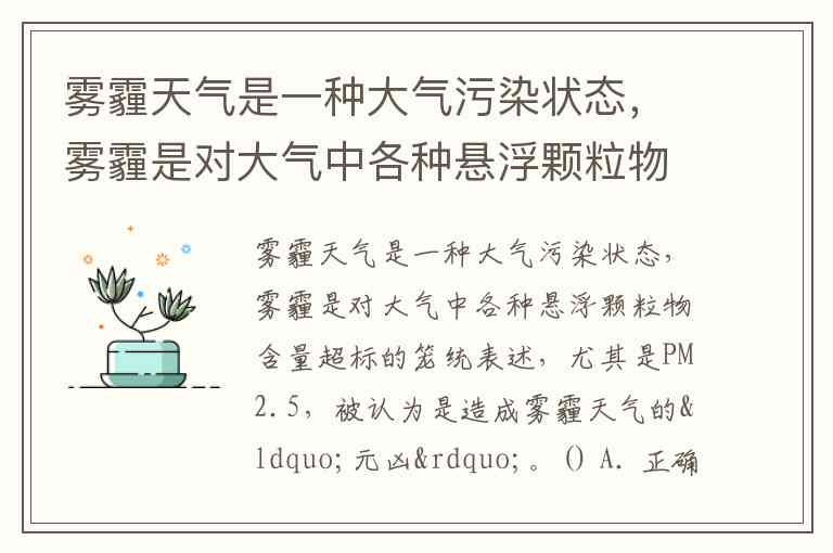 雾霾天气是一种大气污染状态,雾霾是对大气中各种悬浮颗粒物含量超标的笼统表述,尤其是PM2.5,被认为是造成雾霾天气的“元凶”。() A. 正确 B. 错误