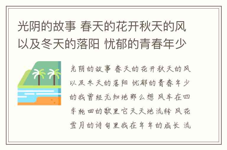 光阴的故事 春天的花开秋天的风以及冬天的落阳 忧郁的青春年少的我曾经无知地那么想 风车在四季轮回的歌里它天天地流转 风花雪月的诗句里我在年年的成长 流水它带阴的故事改变了一个人 就在那多愁善感而初次等待的青春 根据材料,展开联想,自拟题目,写一篇不少于600字的文章,文体不限(诗歌除外)。
