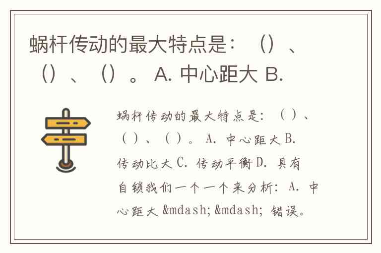 蜗杆传动的最大特点是:()、()、()。 A. 中心距大 B. 传动比大 C. 传动平衡 D. 具有自锁