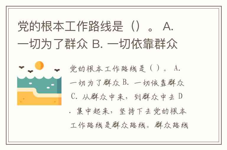 党的根本工作路线是()。 A. 一切为了群众 B. 一切依靠群众 C. 从群众中来,到群众中去 D. 集中起来,坚持下去