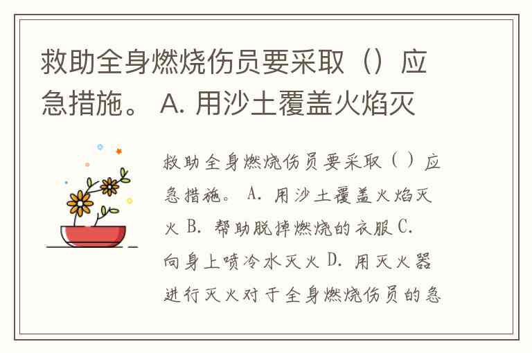 救助全身燃烧伤员要采取()应急措施。 A. 用沙土覆盖火焰灭火 B. 帮助脱掉燃烧的衣服 C. 向身上喷冷水灭火 D. 用灭火器进行灭火
