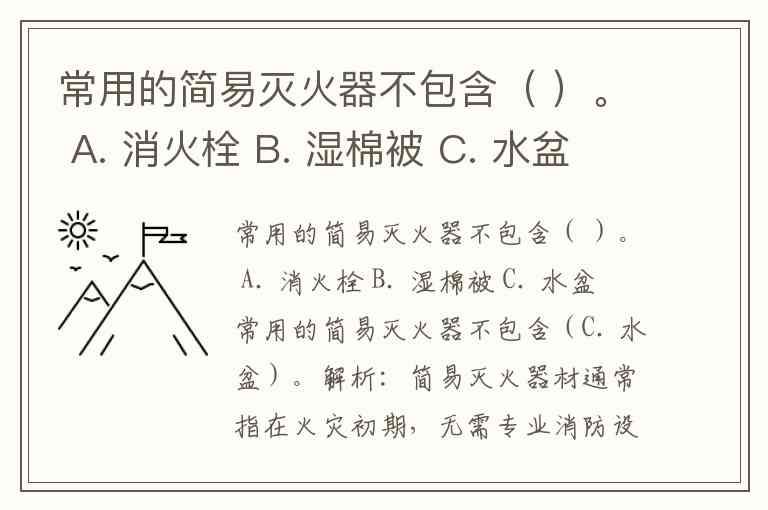 常用的简易灭火器不包含( )。 A. 消火栓 B. 湿棉被 C. 水盆