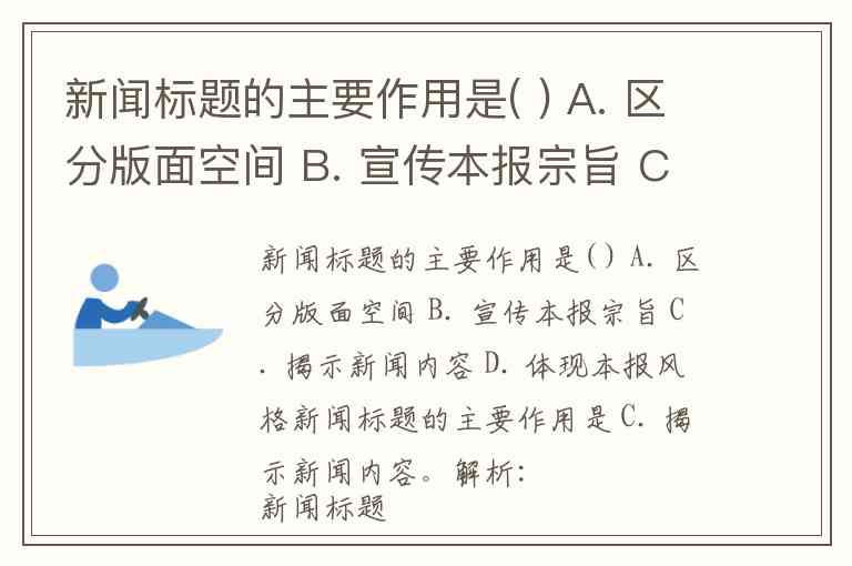 新闻标题的主要作用是( ) A. 区分版面空间 B. 宣传本报宗旨 C. 揭示新闻内容 D. 体现本报风格